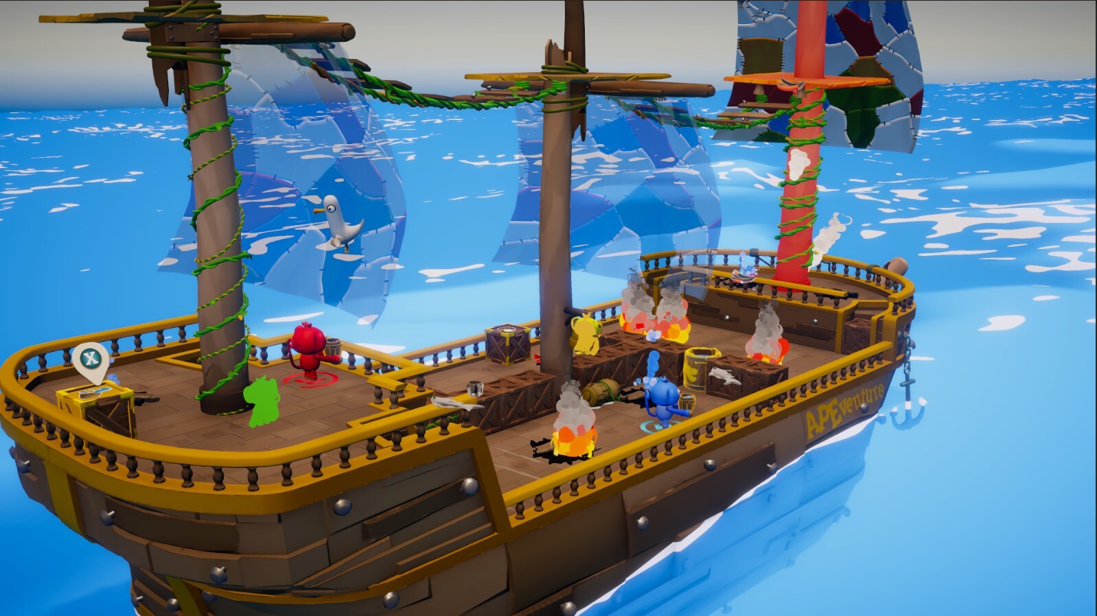 Испытайте на себе пиратский корабль, управляемый обезьянами! Сотрудничайте, чтобы удержать корабль на плаву и успешно вернуть его в порт.