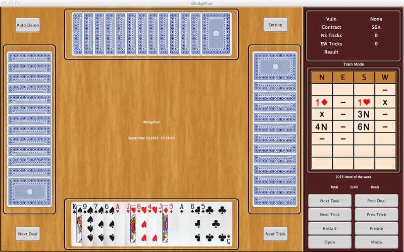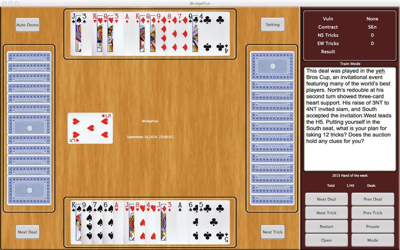 Основная идея iBridgeFun: ПОКАЗАТЬ вам множество классических рук, сыгранных известными мастерами бриджа, с комментариями, иллюстрирующими различные приемы, которые помогут вам улучшить свои игровые навыки. (Это НЕ онлайн-игра)