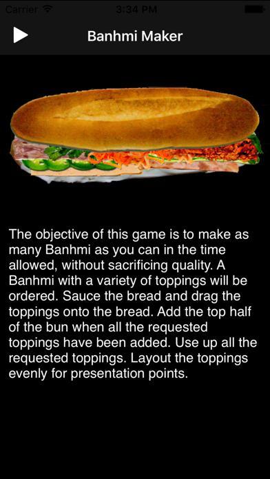 Цель этой игры состоит в том, чтобы сделать как можно больше Banhmi за отведенное время, не жертвуя при этом качеством. Будет заказан Banhmi с различными начинками. Перетащите начинку на булочку. Добавьте верхнюю часть булочки после того, как будут добавлены все запрошенные начинки. Используйте все запрошенные начинки для полных очков исполнения. Равномерно распределите начинку для полного представления.