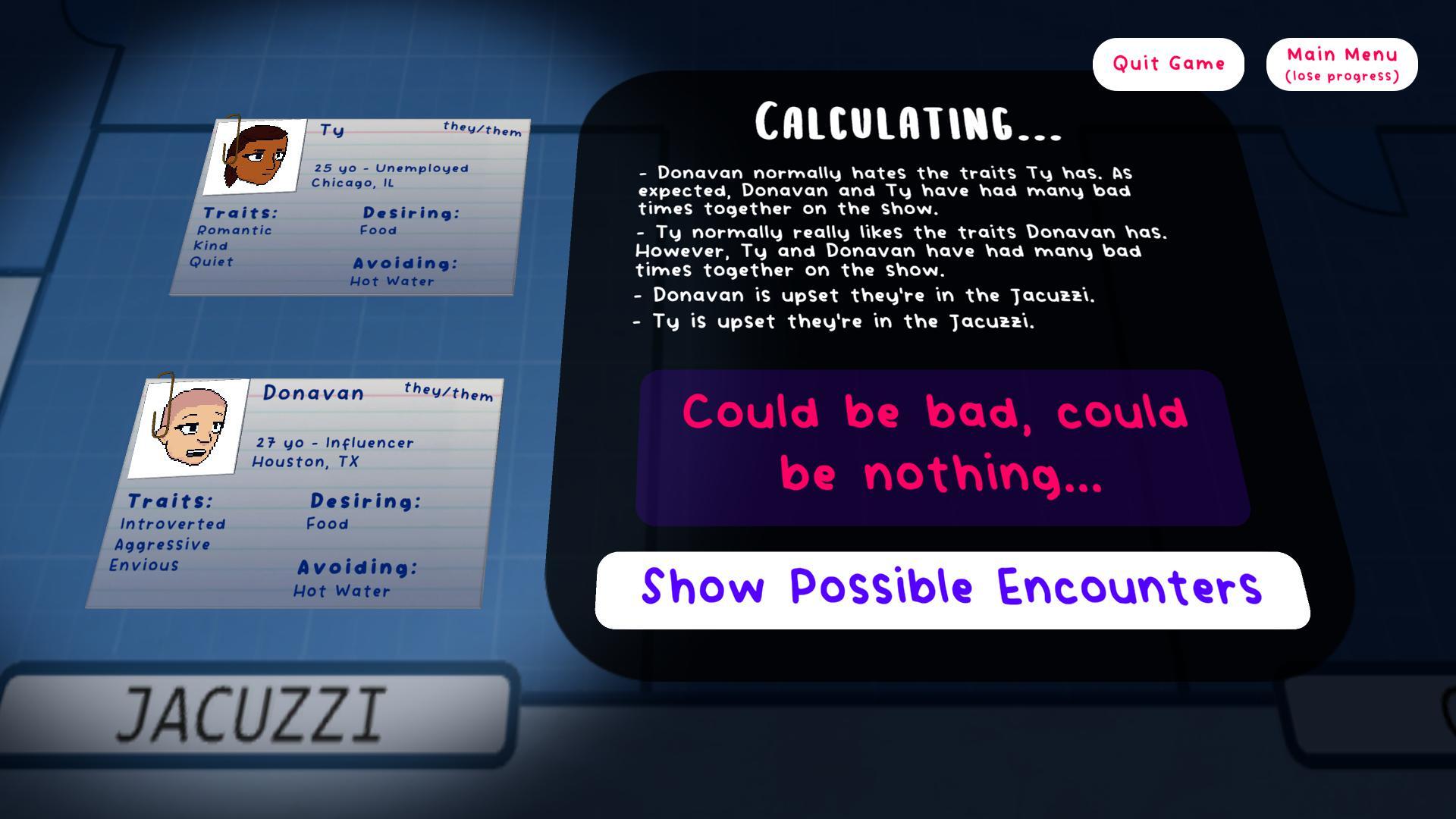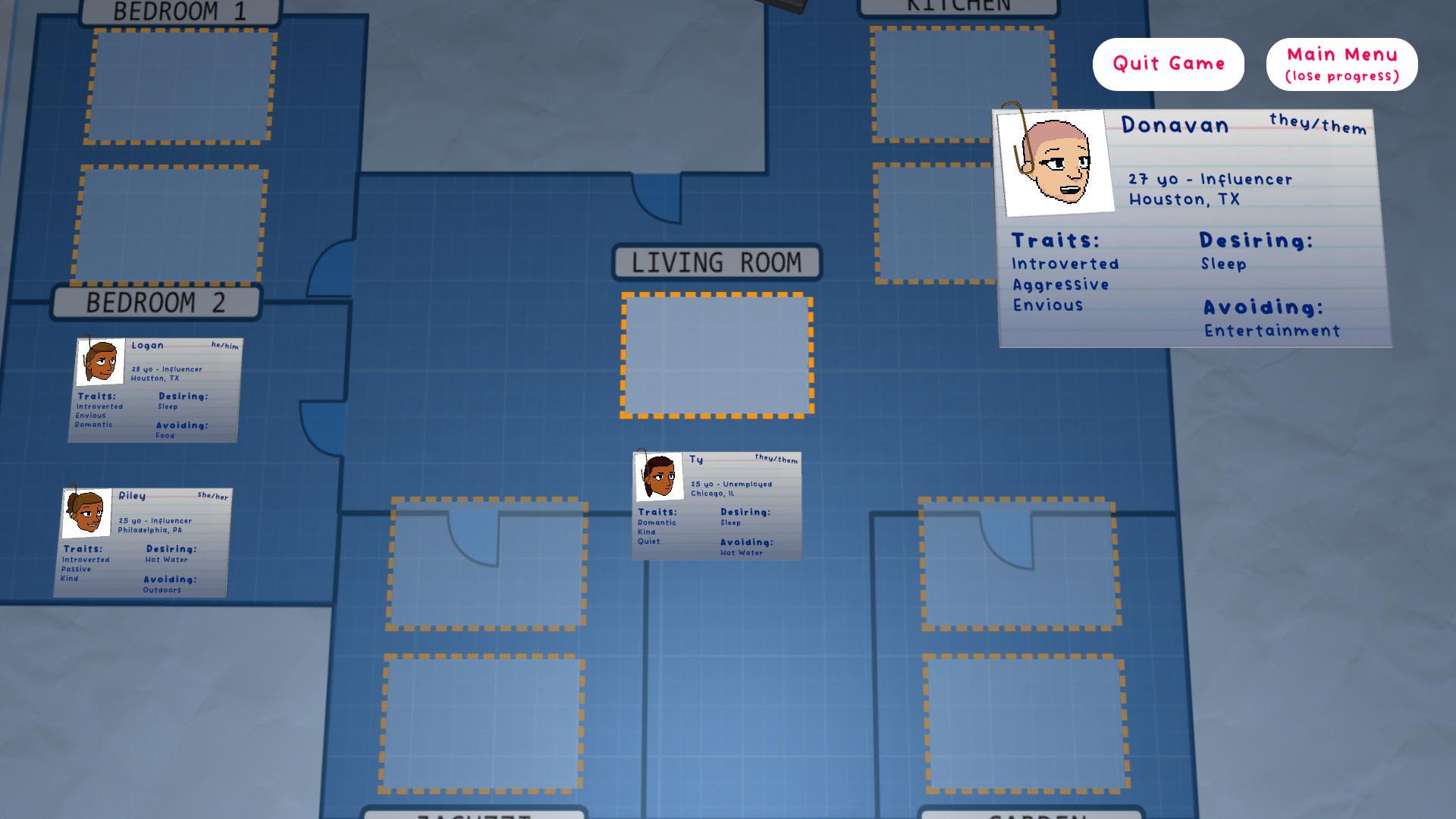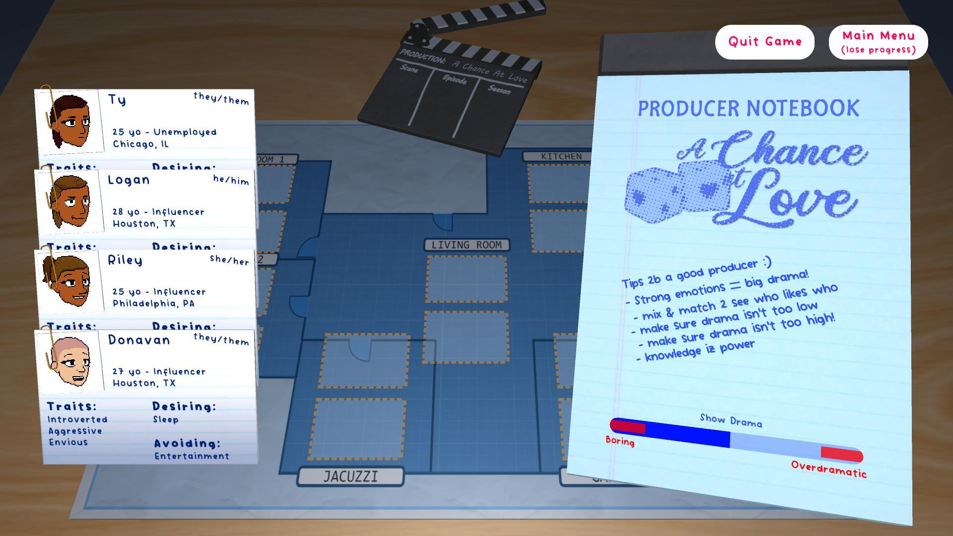 Реалити-шоу – это драма! Возьмите персонажей, поместите их в комнаты друг с другом и наблюдайте, как в их взаимодействиях разворачивается драма. Будь осторожен! Слишком много драмы, и шоу отменят из-за того, что оно слишком неуместно. Слишком мало драмы, и шоу отменят из-за того, что оно слишком скучное. Постарайтесь найти хороший баланс!