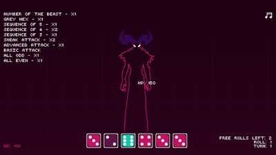 - Ходы: в свой ход у вас есть 2 бесплатных переброса, вы можете перебрасывать столько кубиков, сколько хотите, после 2 бесплатных перебросов переброс стоит hp. Как только вы щелкнете по заклинанию и успешно разыграете его, ваш ход завершится, и вы получите урон от врага.