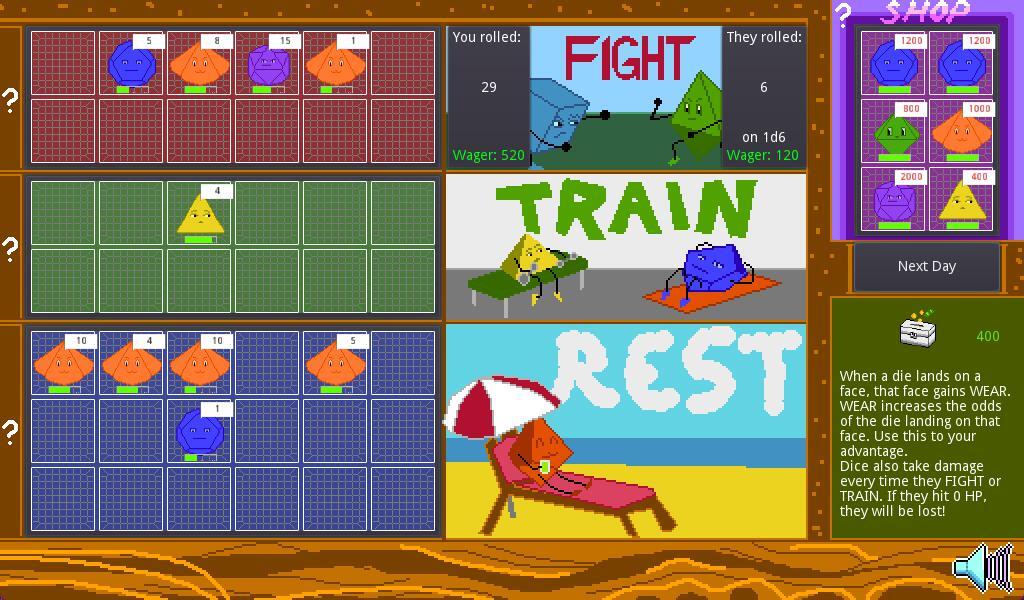 Нажимайте и перетаскивайте кубики между четырьмя областями (Магазин, Бой, Тренировка, Отдых).