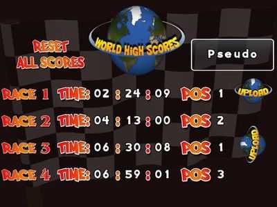 Лучшее время фиксируется для каждой гонки, и вы можете просмотреть таблицу рекордов, нажав «Мировые рекорды» в главном меню.