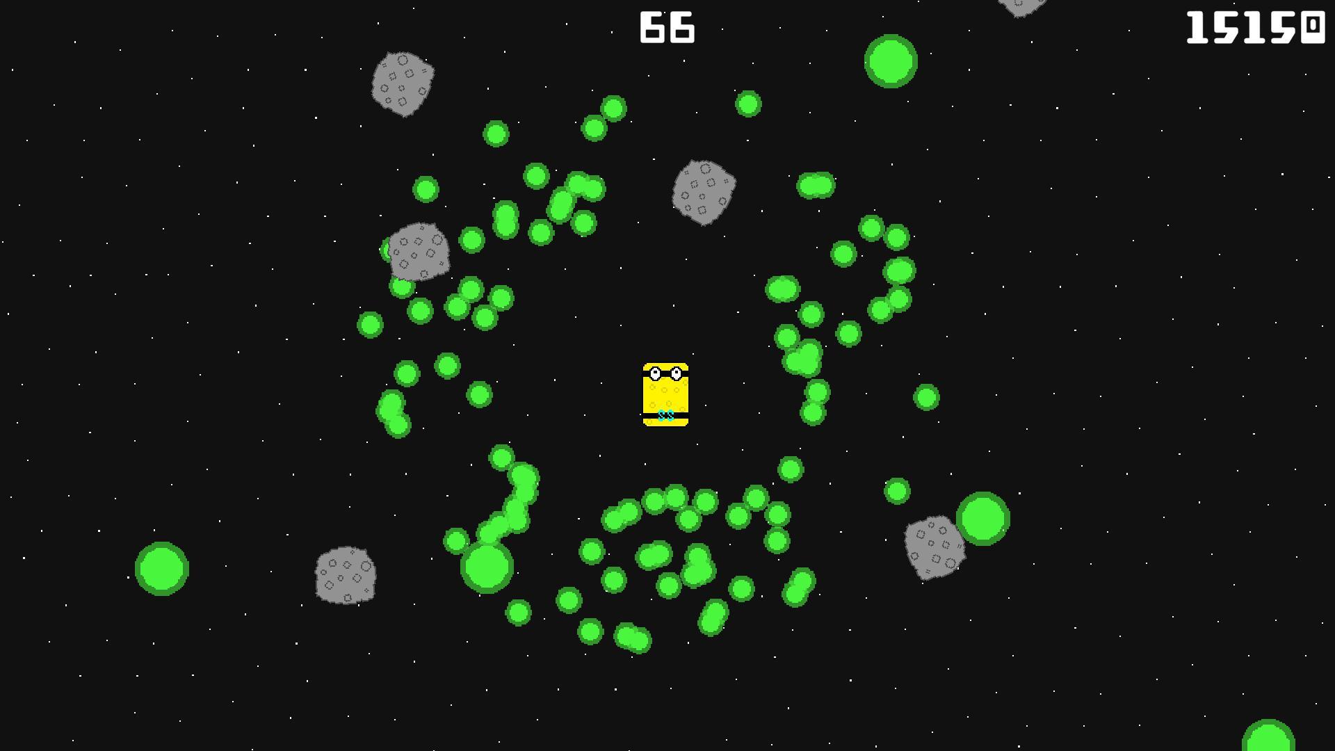 О нет! Похоже, в близлежащем поясе астероидов произошел огромный выброс зеленых шариков! Хорошо, что ты член команды по очистке космической губки! Благодаря вашему пористому телу вы можете легко поглотить всю токсичную жидкость и безопасно избавиться от нее. Поглотите как можно больше зеленых шариков до окончания смены и заслужите уважение коллег и всей галактики! Но будьте осторожны: пояс астероидов может стать довольно беспокойным...