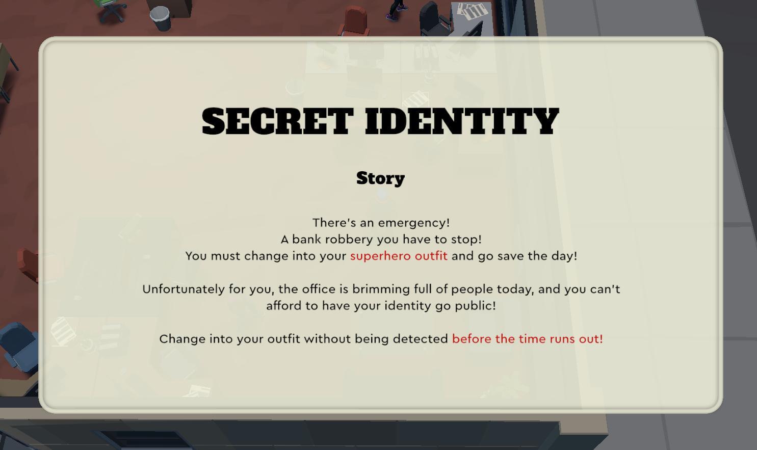 Однако... ВЫ НЕ ОДНИ. Сегодня в офисе полно людей, и вы не можете позволить, чтобы ваша личность стала достоянием общественности! Кроме того, все ваши коллеги пристают к вам по тому или иному поводу - работа, работа, работа... Избегайте их, насколько это возможно, найдите безопасное уединенное место и незаметно переоденьтесь в свой костюм - и пока не истечет время - спасти положение и сохранить свою тайну!