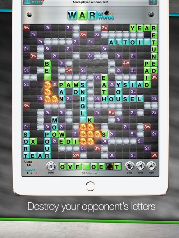 «Война слов» — это динамичный кроссворд с бомбами! Все начинается с пошагового игрового процесса по написанию слов, который вы знаете и любите, и добавляете плитки действий! Вам когда-нибудь хотелось взорвать слова оппонента? Или, может быть, украсть какие-то слова для себя? Теперь вы можете.