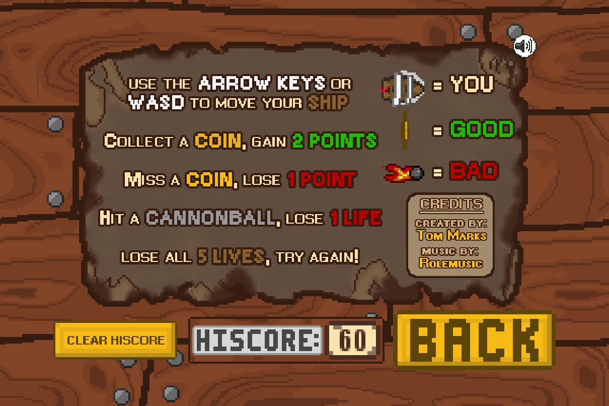 Coin Corsair – это игра, в которой вам предстоит уклоняться от пушечных ядер и собирать монеты. Вы перемещаете свой корабль по карте с сеткой 5x5, пытаясь набрать как можно больше очков, прежде чем вас ударят 5 раз.